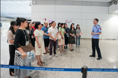 接着,师生在白云边检站党委委员、政治处主任李皓的带领下来到口岸现场,跟随边检站民警切身感受国门卫士真实的工作日常,了解移民管理警察的工作内容。大家在大屏幕前驻足,感受繁忙的口岸现场,观察验证台上移民管理警察热情高效的工作,体会移民警察队伍“国门很大,背后是万家灯火、家国团圆”的责任担当。