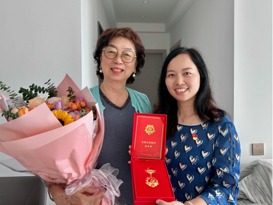 张东蕙书记、郑茨萍老师、杨紫惠老师走访慰问翁贤芝老师,并颁发纪念章
