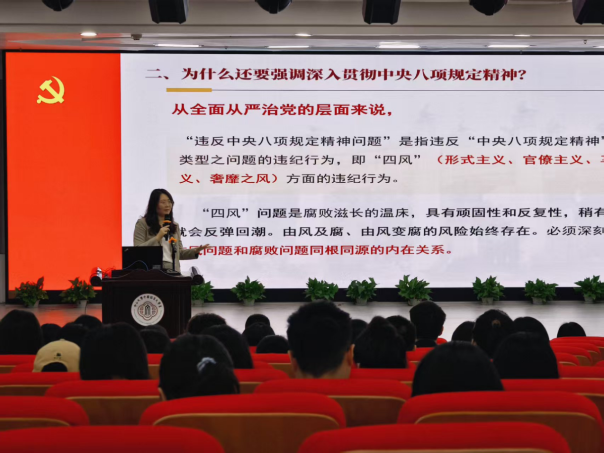 本次宣讲会由马克思主义学院助理教授周寒主讲。周寒助理教授以“深化作风建设 永葆政治本色——深入贯彻中央八项规定精神学习教育宣讲”为主题,从“中央八项规定”的主要内容、深入贯彻中央八项规定精神的重要意义以及违反中央八项规定精神的主要表现等三个维度进行了系统阐述。在宣讲过程中,周寒老师不仅结合中央八项规定精神的历史背景、核心要义和实践成效进行了深入浅出的阐释,还通过引用实际数据和典型案例,深入剖析了违反八项规定精神的典型表现及危害。她指出,作风问题与党性问题本质上是如何正确处理公私关系的问题,强调“党的作风关系党的形象,关系人心向背,关系党的生死存亡”,必须严格落实中央八项规定精神,坚决抵制“四风”问题,以优良作风保障学校事业高质量发展。