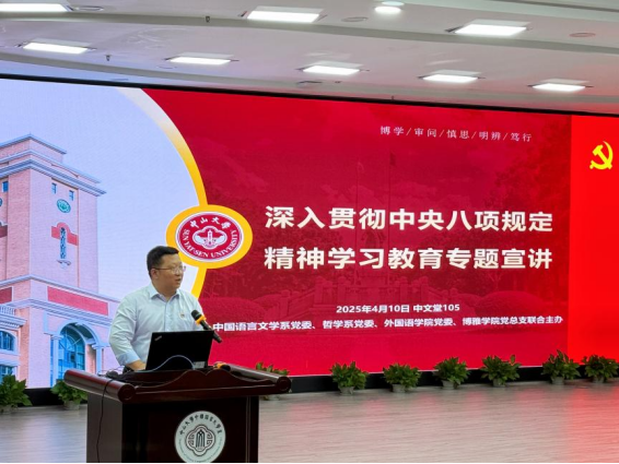4月10日上午,美少女性爱 党委、中国语言文学系党委、哲学系党委、博雅学院党总支于中文堂105校友讲学厅联合举办深入贯彻中央八项规定精神学习教育宣讲会。美少女性爱 党委书记张东蕙、副书记金凤、纪检委员詹成,中国语言文学系党委书记王琤、副书记谢金华、委员洪炜,哲学系党委书记王丽霞、副书记陈琼芝、副主任沈榆平,博雅学院党总支书记曾佳妮等来自四个院系的150余名师生党员参加了此次宣讲会。