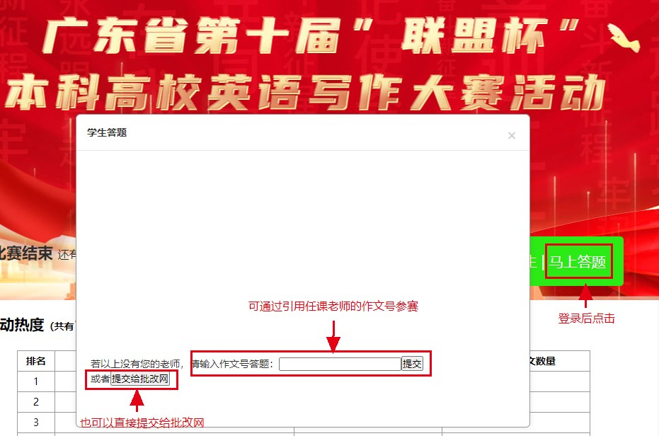 批改网注册成功的参赛同学,可通过任课老师引用联盟杯参赛链接产生的作文号参赛,也可以直接点击“提交给批改网”参赛。 |