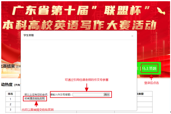批改网注册成功的参赛同学,可通过任课老师引用联盟杯参赛链接产生的作文号参赛,也可以直接点击“提交给批改网”参赛。 |